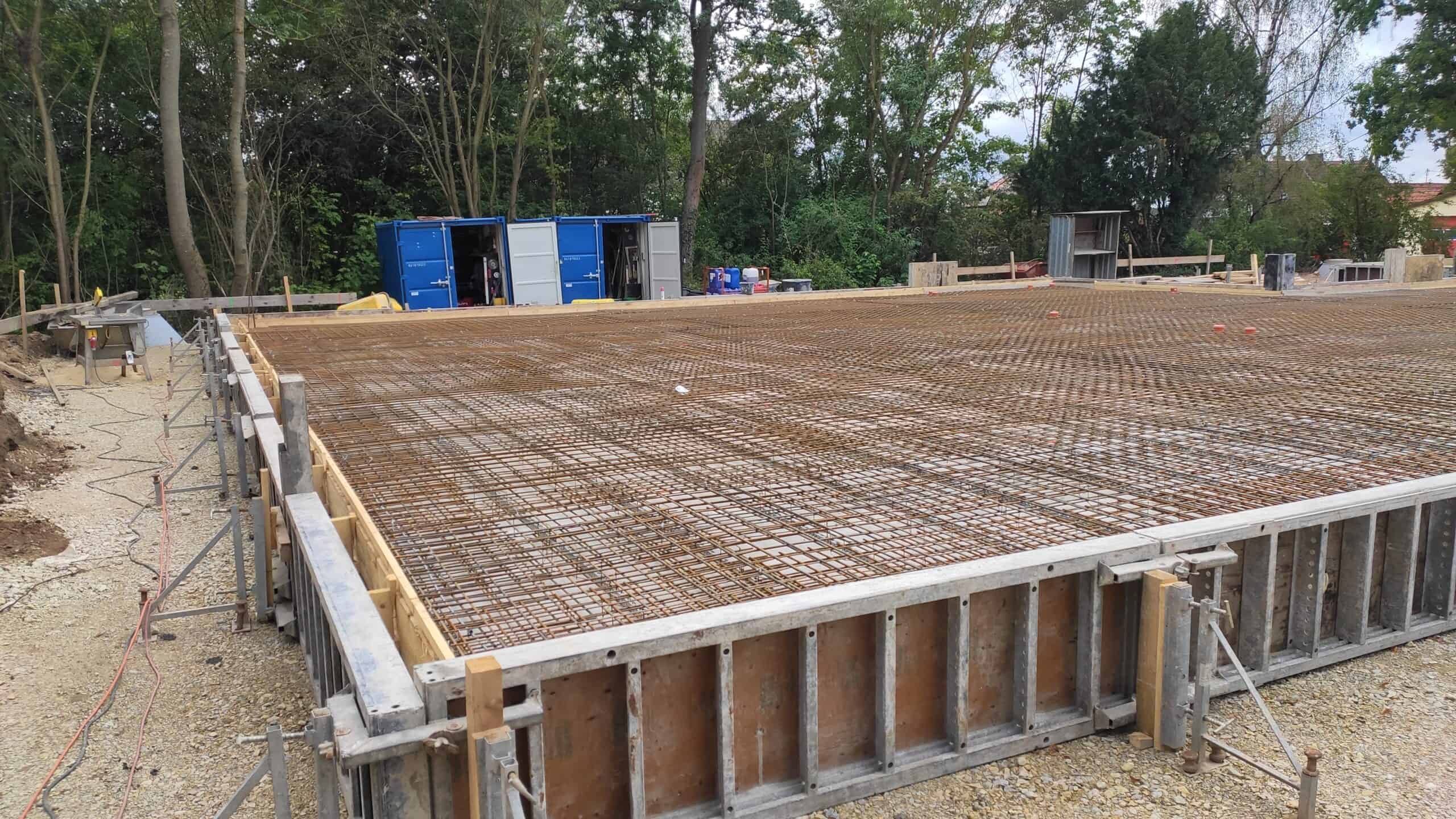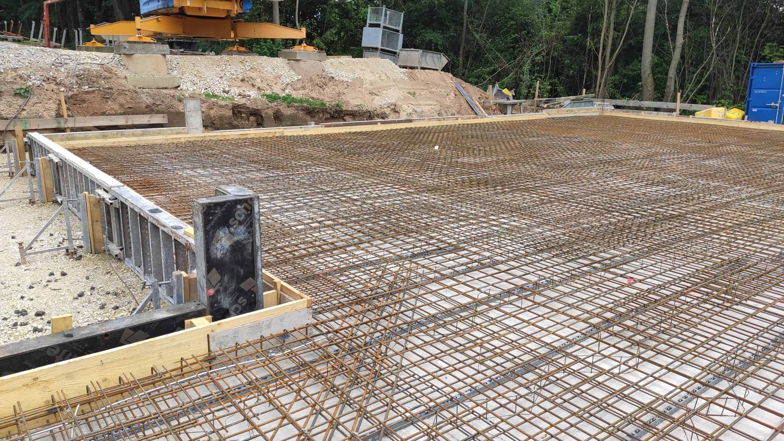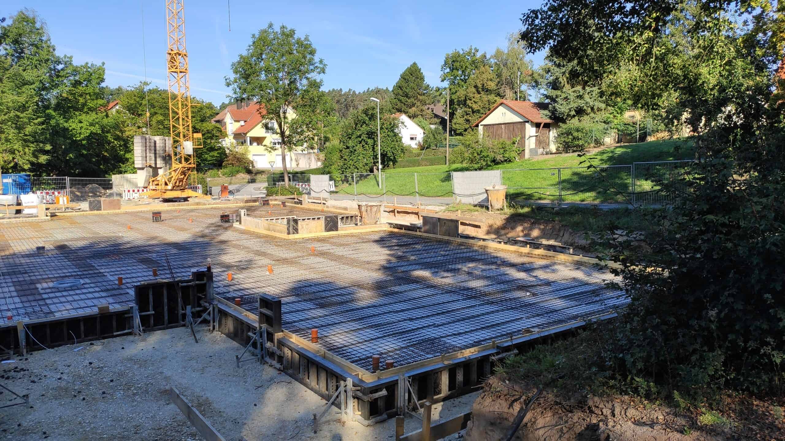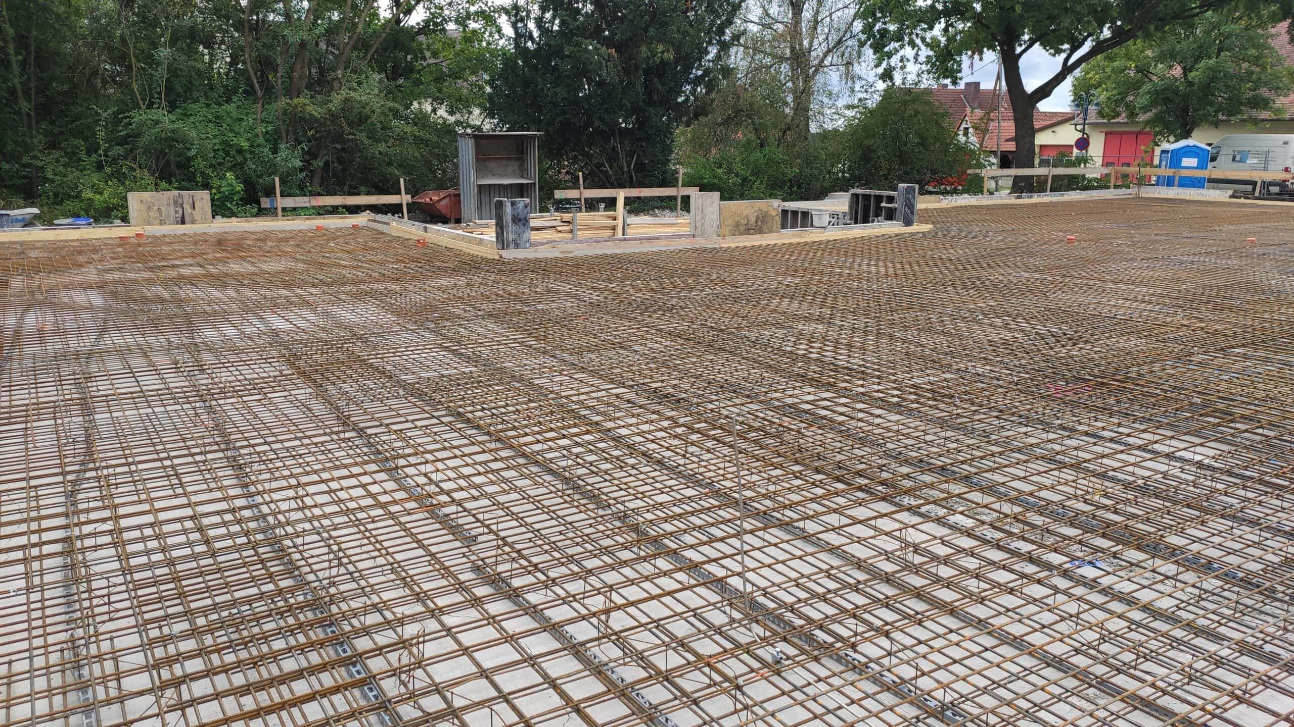2020 errichteten wir in Zentbechhofen bei Höchstadt a. d. Aisch eine moderne Kindertagesstätte mit einem Netto-Bauvolumen von rund 491.000 €. Auf dem Bild ist die sorgfältige Herstellung der Bodenplatte mit Bewehrung zu sehen – ein entscheidender Schritt für die Stabilität und Langlebigkeit des Gebäudes.